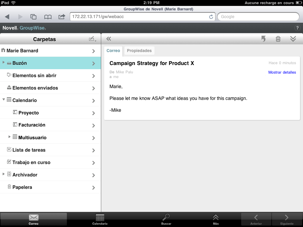 Cuando entre en GroupWise mediante el navegador Web de la tableta, se mostrará el buzón.