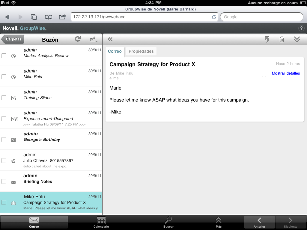 El buzón contiene todos los mensajes de correo recibidos y proporciona opciones para enviar mensajes nuevos. Asimismo, puede ver citas, tareas y notas en el buzón hasta que las acepta, momento en el que pasan a mostrarse solo en el calendario.