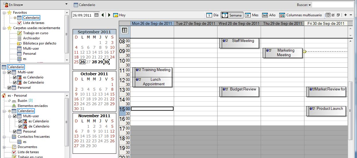 El calendario multiusuario permite ver una programación combinada de los usuarios y recursos en una vista gráfica de día, semana, mes, año o de columnas multiusuario (la vista Columnas multiusuario es una vista de día que muestra la programación de cada usuario en una columna distinta). Es fácil seleccionar y deseleccionar usuarios y recursos para que sus citas se muestren, o se oculten, en la vista combinada. Use el calendario multiusuario para buscar las programaciones de los usuarios o para averiguar qué sala de reuniones de la empresa está libre a una hora concreta.