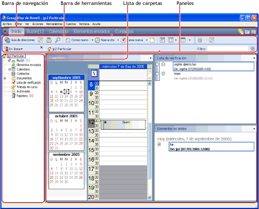 El área principal de trabajo en GroupWise se denomina ventana principal. Desde la ventana principal de GroupWise, puede leer mensajes, programar citas, ver el calendario, gestionar contactos, cambiar el modo de ejecución de GroupWise, abrir carpetas y documentos y mucho más.