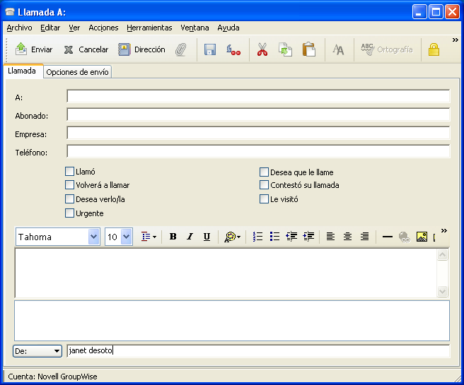 Al enviar un mensaje de correo electrónico desde GroupWise, puede hacerlo en formato de texto o HTML. Además, puede decidir si desea añadir archivos adjuntos, añadir una firma o tarjeta digital al mensaje o revisar la ortografía antes de enviarlo.