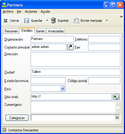 Utilice esta página para especificar un nombre para la organización, un número de teléfono y de fax, el contacto principal de la organización, la dirección, el sitio Web y comentarios acerca de esta organización.