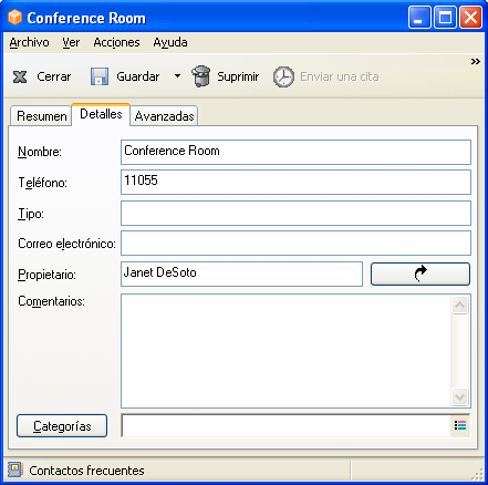 La guía de direcciones de GroupWise incluye recursos definidos por el administrador de GroupWise. Se puede añadir un recurso personal a la carpeta Contactos frecuentes o a otra carpeta personal Contactos.