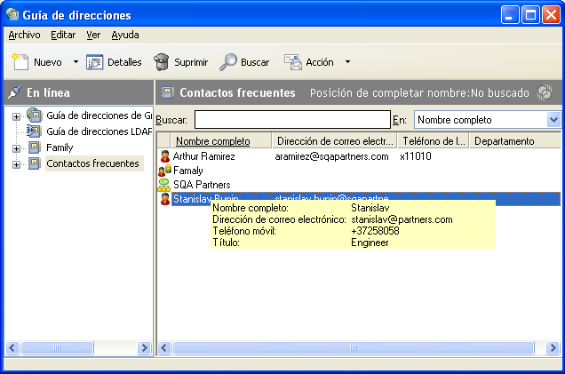La información de resumen acerca de los usuarios aparece en una guía de direcciones y en el Selector de direcciones cuando coloque el puntero del ratón encima de ese nombre. La misma información aparece en los campos , , o de un mensaje si primero hace clic en el nombre. A esta visualización se le denomina Información rápida.