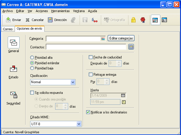 Si está enviando mensajes a sistemas distintos de GroupWise*, recuerde que dichos sistemas deben tener capacidad de seguimiento de estado para poder devolver el estado de sus mensajes salientes a su sistema de GroupWise.