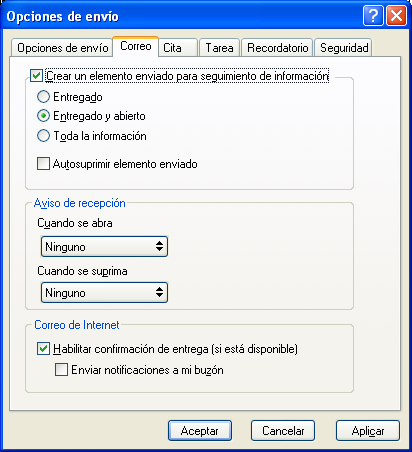 Para recibir siempre avisos de recepción de los elementos que envíe, haga clic en > , haga doble clic en y, a continuación, en la pestaña que corresponda al tipo de elemento.