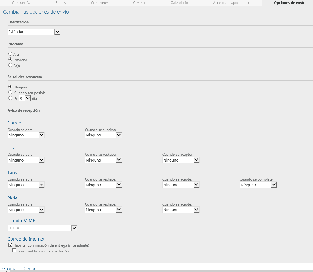 Para recibir siempre una notificación de los elementos que envíe, haga clic en el icono Opciones