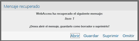 Haga clic en Omitir para conservar los mensajes guardados automáticamente pero no recuperarlos en WebAccess. La próxima vez que inicie WebAccess, se abrirá la ventana de almacenamiento automático.