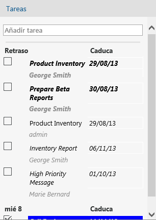 Cuando haya finalizado la tarea, puede marcarla como terminada. Las tareas que marque como terminadas no se trasladarán al día siguiente en el calendario. Las tareas terminadas se distinguen porque presentan una marca de verificación en el calendario. Las tareas cuya fecha de caducidad se ha rebasado se muestran en la sección Retraso de la lista de tareas.