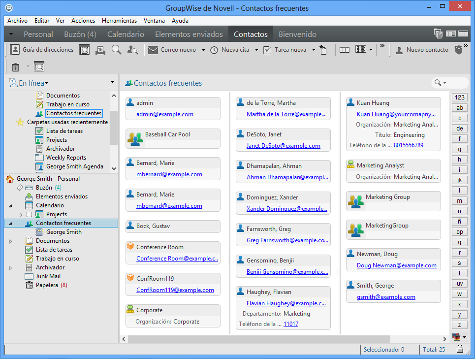 de la lista de carpetas de GroupWise corresponde a la guía de direcciones Contactos frecuentes. Las carpeta Contactos adicionales corresponden a las guías de direcciones personales.