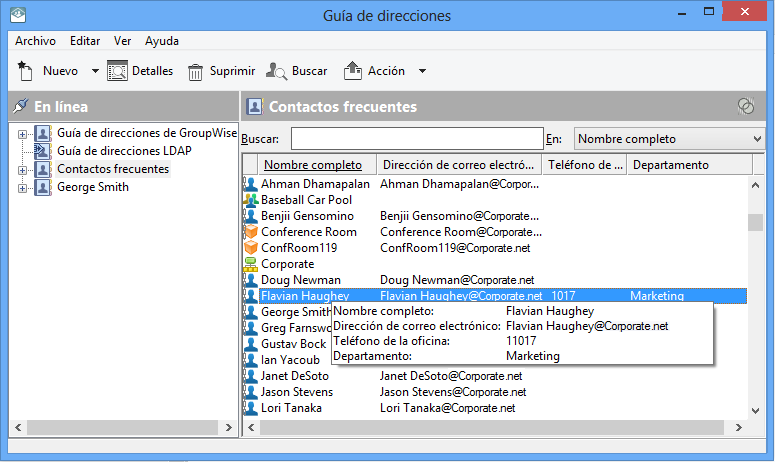 en la barra de herramientas de la ventana principal. El panel izquierdo muestra la guía de direcciones de GroupWise, la guía de direcciones LDAP, la guía de direcciones Contactos frecuentes y cualquier guía de direcciones personales que haya creado.