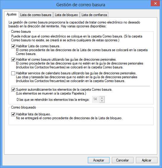 Si no se ha habilitado la Lista de correo basura o la Lista de bloqueo, seleccione Habilitar Lista de correo basura o Habilitar Lista de bloqueo.