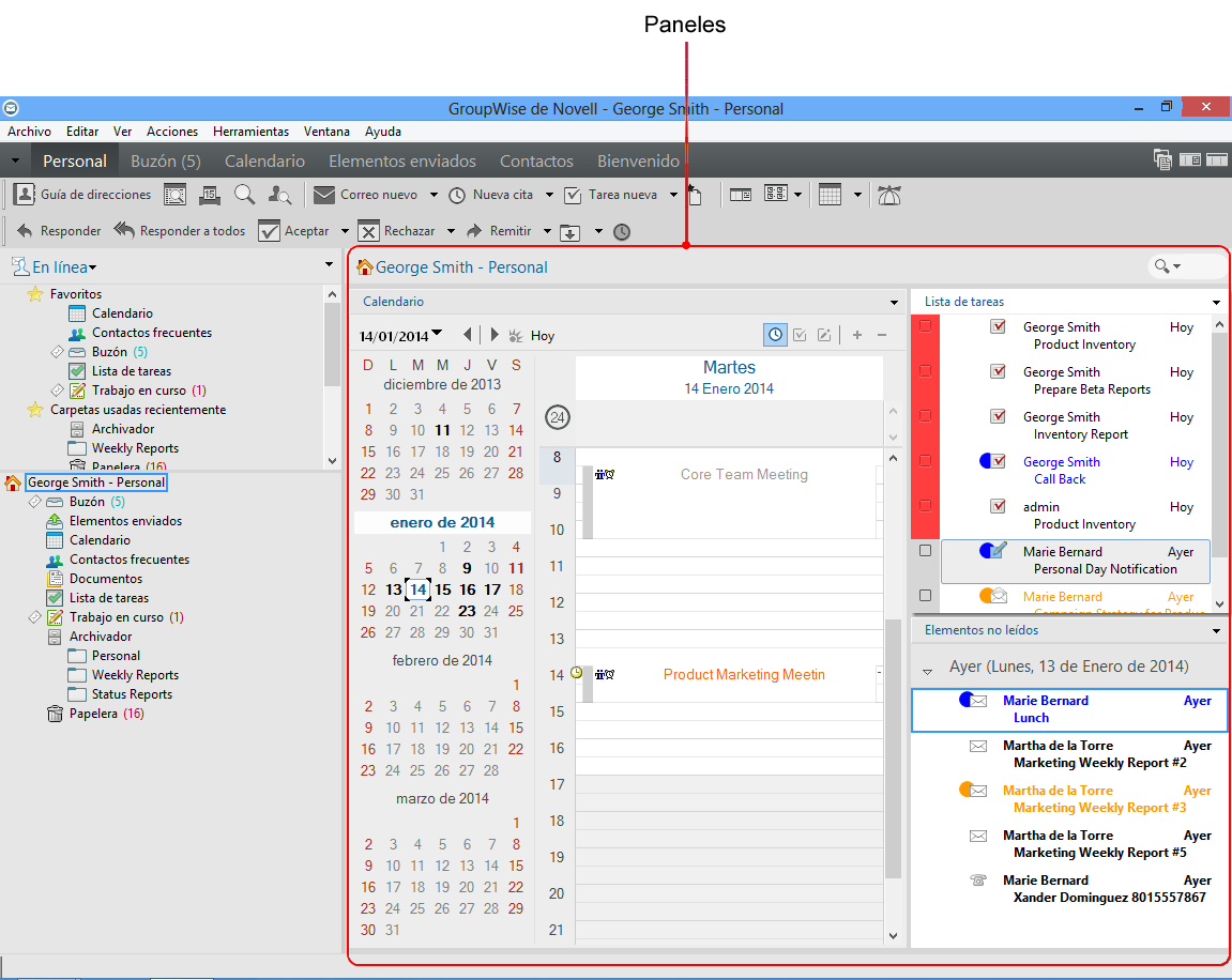 Un panel es una vista personalizada con información de GroupWise. Por ejemplo, la vista principal por defecto incluye un panel de mensajes no leídos que muestra una lista de los elementos que aún no ha leído. El panel de lista de tareas es otro panel por defecto de la vista principal. Este panel muestra los elementos de la carpeta Lista de tareas.