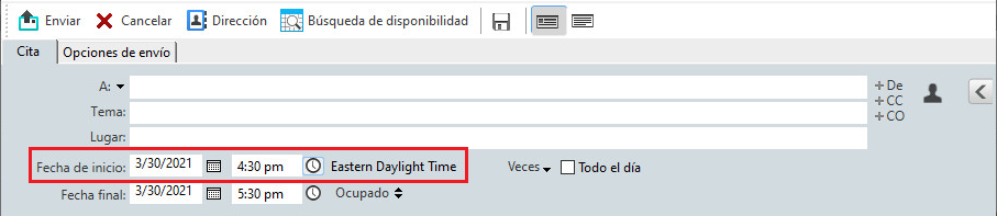Cuando se selecciona una zona horaria al crear una cita, la cita se ajusta para que se programe a la hora que se defina en la zona horaria seleccionada. Por ejemplo, si programa una cita a las 16:30 hora del este de Estados Unidos, y se encuentra en la zona horaria del Pacífico, aparecerá en el calendario a la 13:30 PDT.