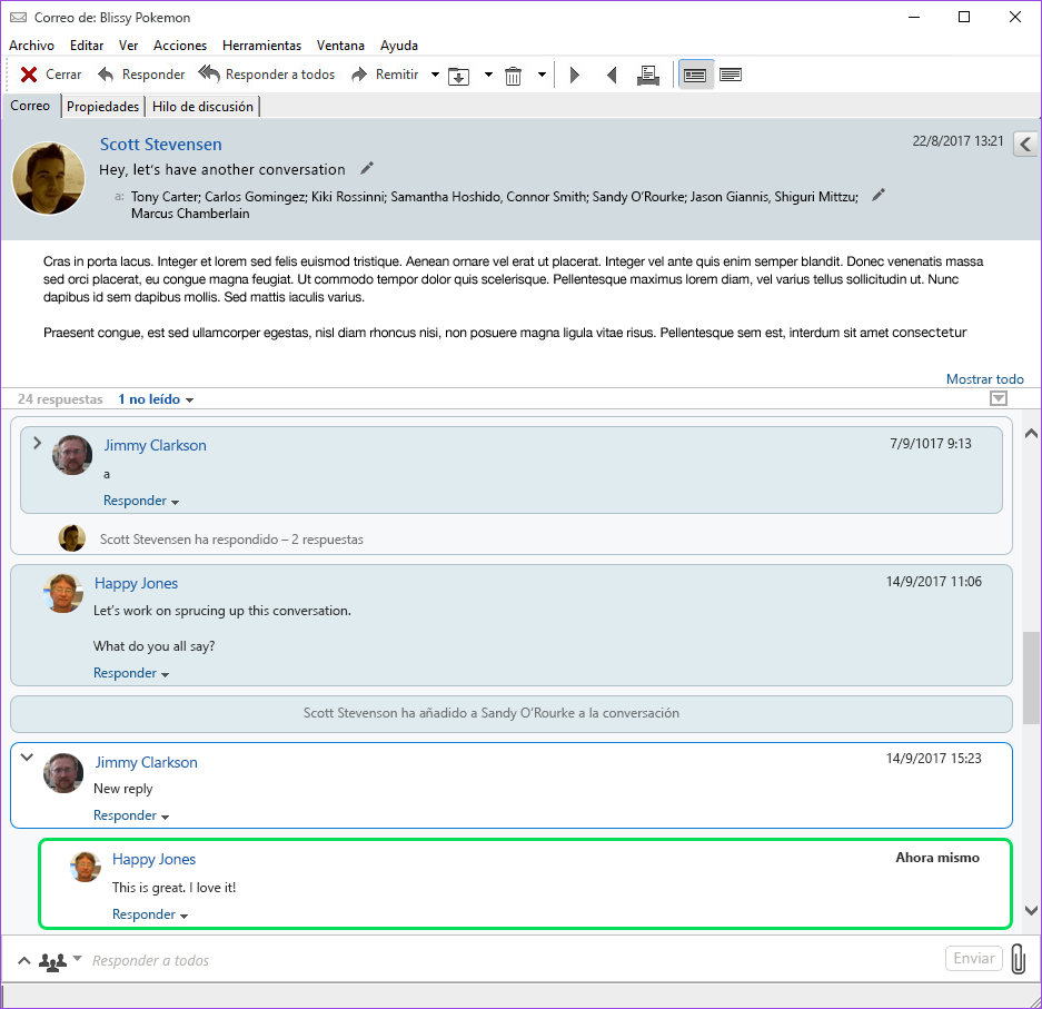 Las respuestas nuevas de la conversación tienen un borde verde. El color verde se mantiene hasta 3 minutos después de leer el mensaje. Puede borrar los elementos sin leer de un elemento de la lista haciendo clic con el botón derecho en el número verde de no leídos situado junto al elemento.