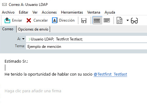 En el ejemplo que se muestra a continuación, el redactor del mensaje ha añadido “Usuario LDAP” en el campo A y se ha dirigido a él como “Sr.” en el cuerpo del mensaje. Al escribir la primera frase, el redactor del mensaje escribió “@test” y, a continuación, pudo seleccionar el usuario TestFirst TestLast en la lista emergente de la función Completar nombre de la guía de direcciones. Esta última acción insertó el nombre del destinatario enlazado en el cuerpo del mensaje y añadió a ese usuario en el campo A del elemento de correo.