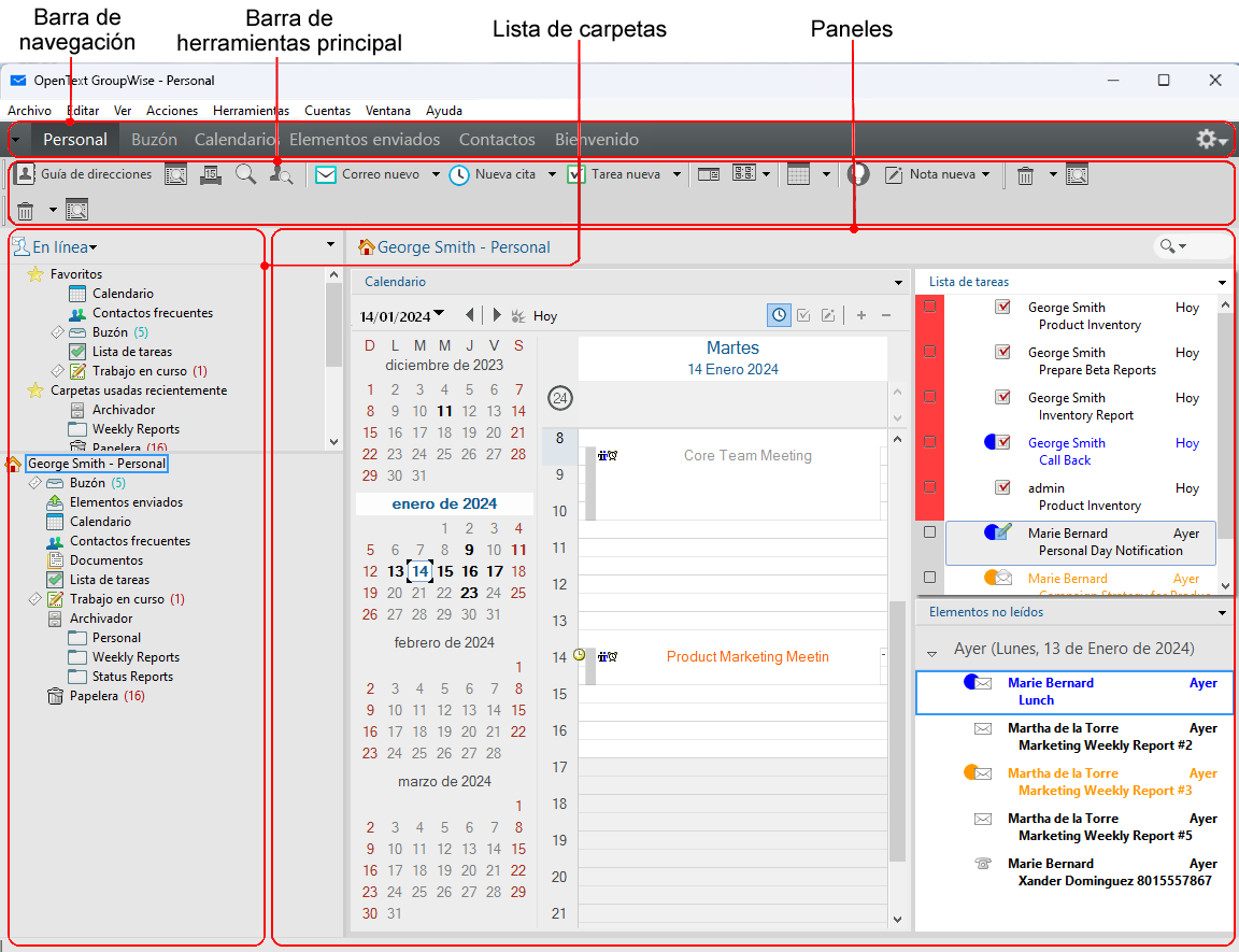 El área principal de trabajo en GroupWise se denomina ventana principal. En la ventana principal puede leer mensajes, programar citas, ver el calendario, gestionar contactos, cambiar el modo de ejecución de GroupWise, abrir carpetas y documentos y mucho más.