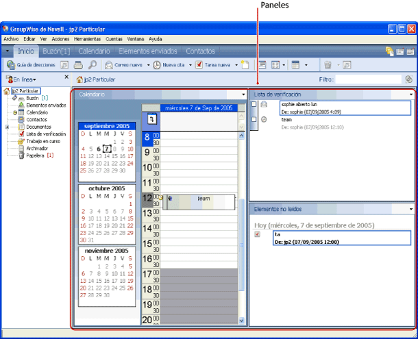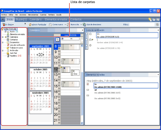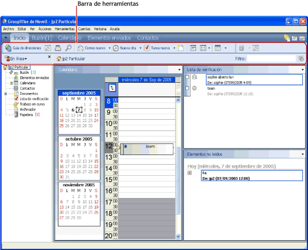 El área principal de trabajo en GroupWise se denomina ventana principal. En la ventana principal de GroupWise, puede leer los mensajes, programar citas, ver el Calendario, gestionar contactos, cambiar el modo de GroupWise que se está ejecutando, abrir carpetas, abrir documentos y mucho más.