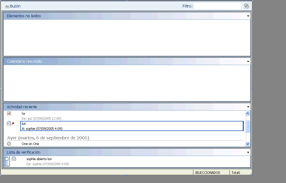 Un panel muestra una vista personalizada con información de GroupWise. Por ejemplo, la vista principal por defecto incluye el panel de mensajes no leídos. En este panel se muestra una lista de elementos que aún no ha leído. El panel de lista de verificación es otro panel por defecto de la vista principal. Este panel muestra los elementos de la carpeta de lista de verificación.