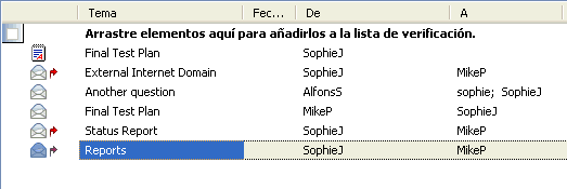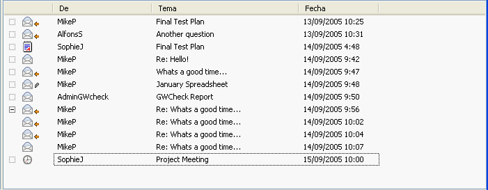 La vista Detalles muestra una lista de los elementos y la información existente sobre ellos en columnas, que incluyen Tema, Fecha, CC, Prioridad, Clase de documento, Fecha de caducidad, Tamaño, Nº versión, entre otras muchas categorías. Detalle es la vista del Buzón por defecto si no ha modificado las propiedades del mismo. Para obtener información acerca de cómo añadir o volver a ordenar columnas, consulte la Section 7.18, Uso de las columnas del Buzón.