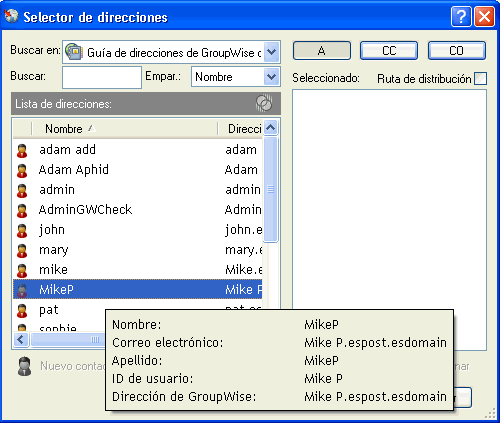 Figure 8-6 Selector de direcciones con información acerca de un usuario