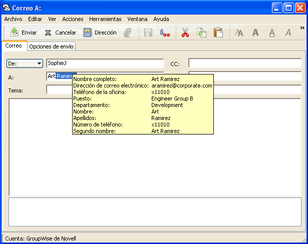La información de resumen acerca de los usuarios aparecerá en una guía de direcciones y en el Selector de direcciones cuando coloque el puntero del ratón encima de ese nombre. La misma información aparecerá en los campos o de un mensaje si primero hace clic en el nombre. A esta visualización se le denomina Información rápida.