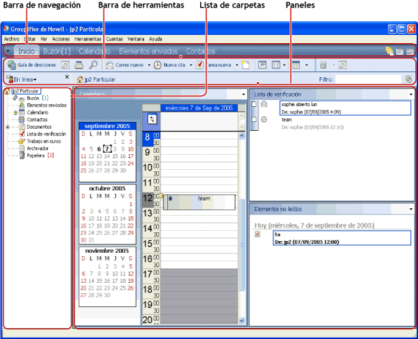 La vista principal es una vista rápida que muestra la información más importante para usted. En ella se usan paneles para mostrar la información por secciones. Por defecto, la vista principal muestra el calendario del día, los elementos de la lista de verificación, los mensajes sin leer y el Visor rápido en la parte derecha de la ventana. Los paneles están organizados en una vista de dos columnas.