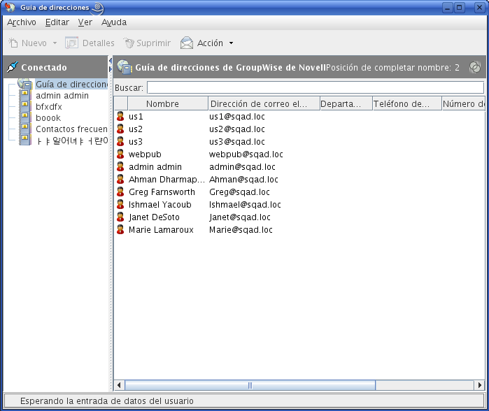 Para abrir una guía de direcciones, haga clic en el botón de la barra de herramientas de la ventana principal. La guía de direcciones se abre y se muestra un panel a la izquierda en el que aparecen la guía de direcciones de GroupWise, la guía de direcciones Contactos frecuentes y cualquier guía de direcciones personal que haya creado.