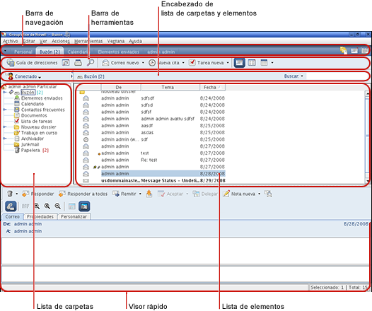 El área principal de trabajo en GroupWise se denomina ventana principal. Desde la ventana principal de GroupWise, puede leer mensajes, programar citas, ver el calendario, gestionar contactos, cambiar el modo de ejecución de GroupWise, abrir carpetas y documentos y mucho más.