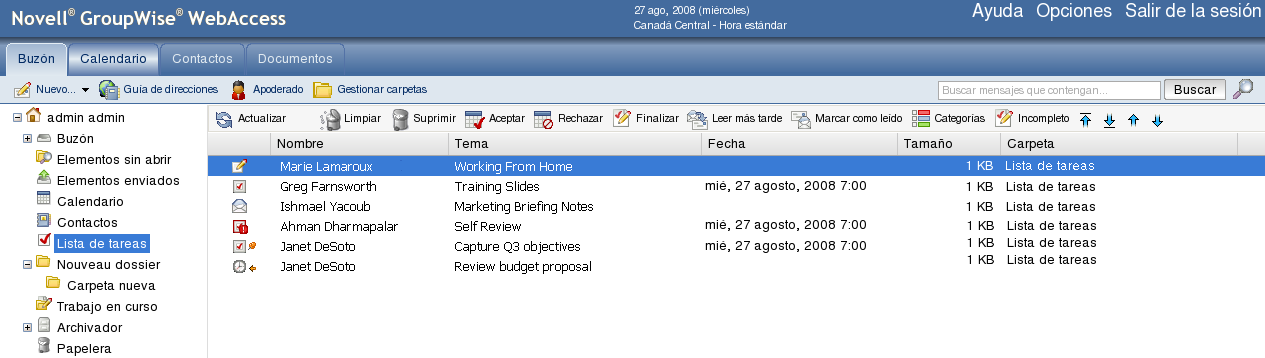 NOTA:La carpeta Lista de tareas sustituye a la carpeta Lista de verificación de las versiones anteriores de GroupWise. Para acceder a una comparación entre la carpeta Lista de tareas y la carpeta Lista de verificación, consulte Carpeta Lista de tareas.