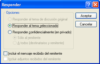 Utilice Responder para responder a un elemento. Puede responder a quienes hayan recibido el elemento original o sólo al remitente, sin necesidad de crear un nuevo mensaje y asignarle dirección. También puede incluir en su respuesta una copia del mensaje original. La respuesta incluye antes del texto del tema original. Puede modificar el texto del tema si lo desea.