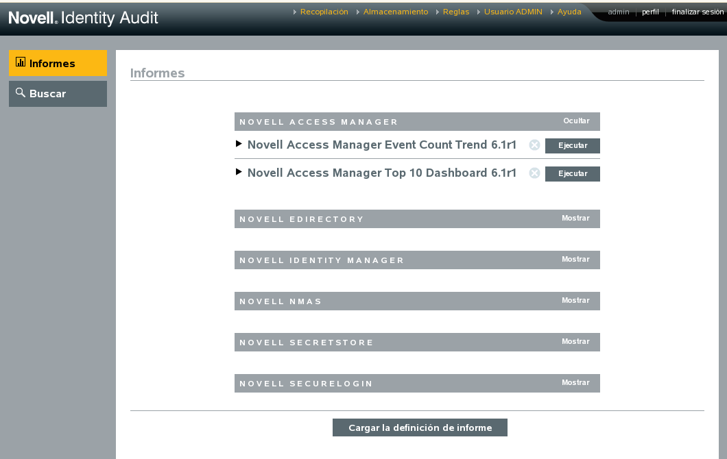 Figura 1-1 Interfaz de Novell Identity Audit (vista de administrador)