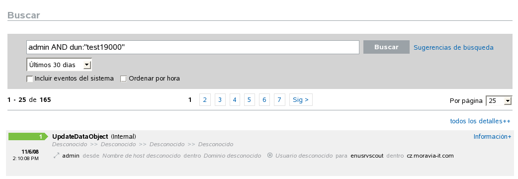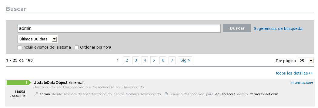 La búsqueda ofrece como resultado un conjunto de eventos. Los usuarios pueden ver información de eventos detallada o básica, así como configurar el número de resultados por página. Los resultados de búsqueda se muestran por lotes. El tamaño predeterminado de los lotes es de 25 resultados, pero esto se puede modificar fácilmente.