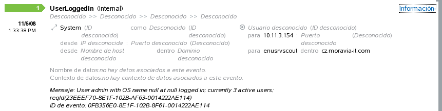 La información de los eventos se clasifica en Información de iniciador e Información de destino. Si determinados datos no están disponibles para un campo de evento en concreto, los campos se etiquetan como .