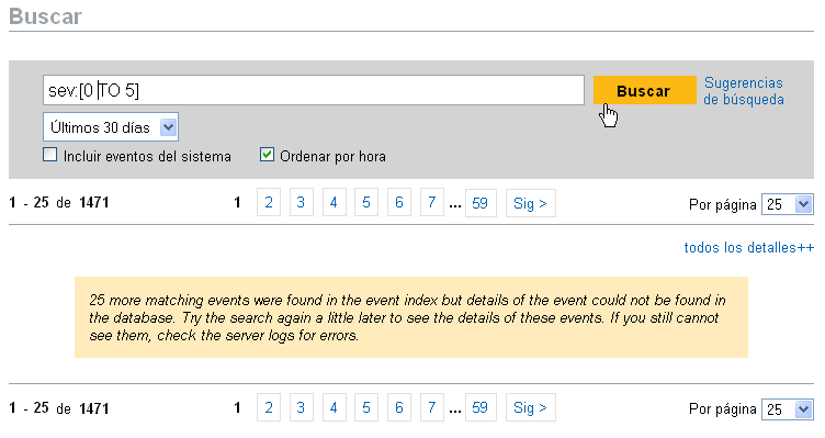 De forma ocasional, el motor de búsqueda puede indexar los eventos más rápido que si se insertaran en la base de datos. En caso de que el usuario ejecute una búsqueda que le devuelva eventos que no se han incluido en la base de datos, el usuario obtendrá un mensaje en el que se le indicará que algunos números de eventos coinciden con la solicitud de búsqueda pero no se pueden encontrar en la base de datos. Por norma general, si la búsqueda se realiza posteriormente, los eventos se encontrarán en la base de datos y la búsqueda se realizará con éxito.