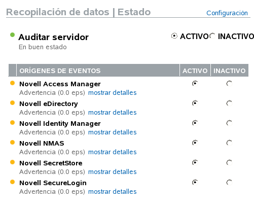 Activo: un indicador verde significa que el origen del evento está activo y que Identity Audit ha recibido datos que provienen de él.