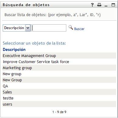 Haga clic en el nombre de un usuario o un grupo para seleccionarlo. El ejemplo siguiente de página de búsqueda de objetos corresponde a una búsqueda de todos los grupos: