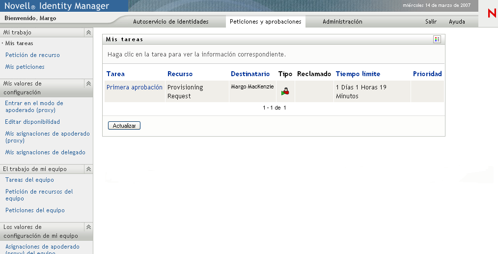 Por defecto, tras entrar a la sesión de la interfaz del Gestor de identidades, se abre la pestaña y aparece la página Mis tareas: