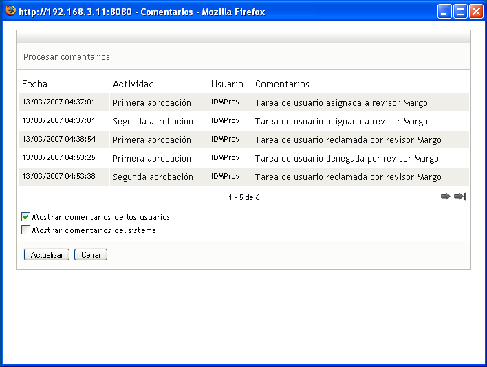 Una ventana emergente le permitirá ver los comentarios de los usuarios y del sistema. El orden en que aparecen los comentarios está determinado por la marca horaria asociada a cada uno de ellos. Los comentarios introducidos en primer lugar se muestran primero. En los flujos de aprobación en paralelo, el orden de las actividades que se llevan a cabo simultáneamente puede ser impredecible.