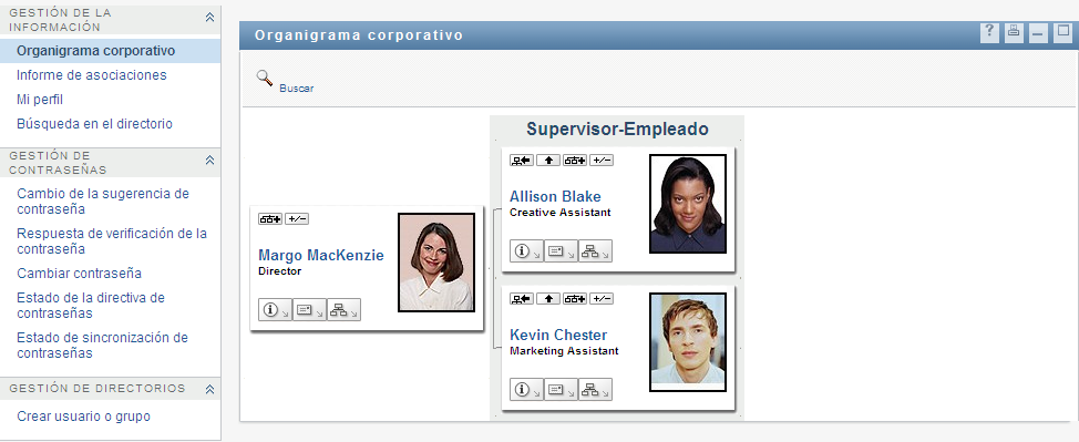 Por defecto, tras entrar a la sesión de la aplicación de usuario del Gestor de identidades, se abre la pestaña Autoservicio de identidades y aparece la página Organigrama corporativo: