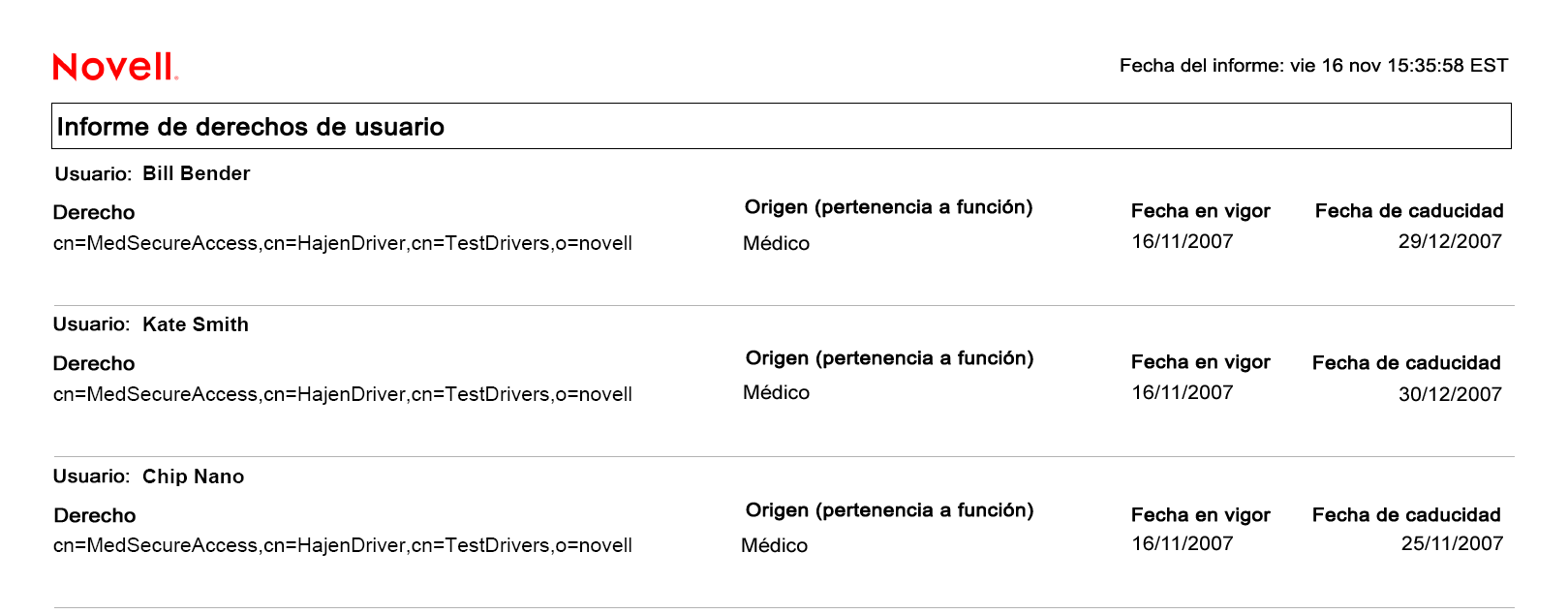 Figura 19-5 Ejemplo de informe de derechos de usuario: detalles de usuarios de cada derecho
