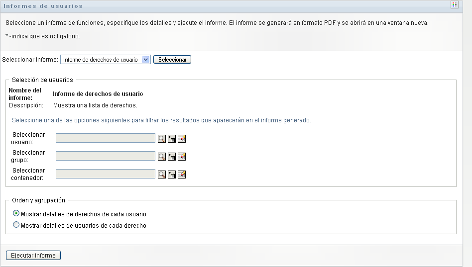 Para crear y ver un informe de derechos de usuario:
