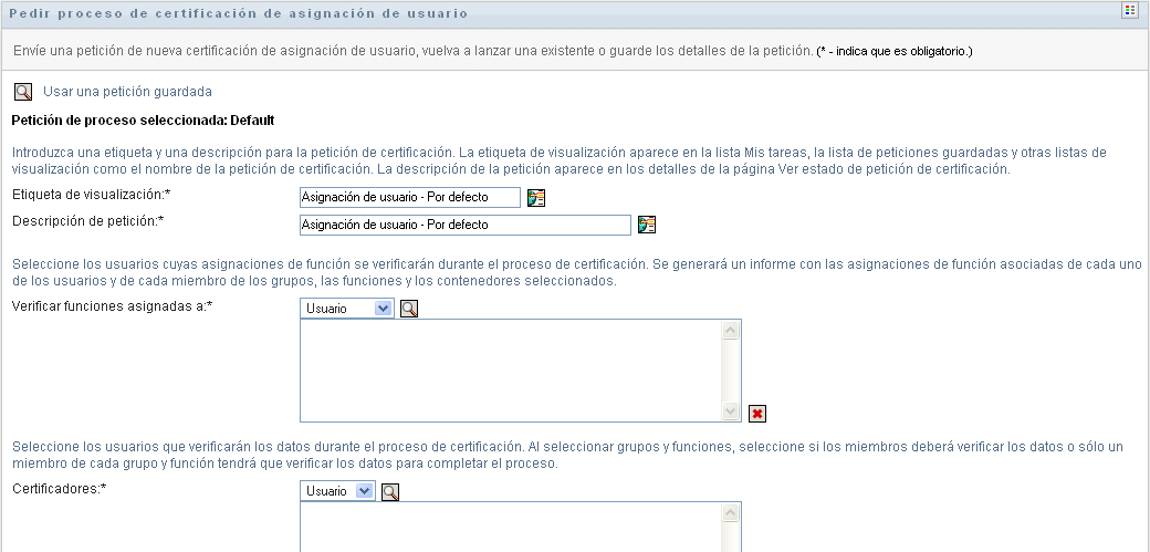 Debe seleccionar como mínimo un usuario, grupo o función como usuario certificador para iniciar un proceso de certificación. Sin embargo, no es necesario seleccionar ninguno para guardar la petición.