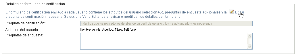 En el campo , puede incluir opcionalmente una o más preguntas para que las responda el usuario certificador durante la ejecución del proceso de certificación. No es obligatorio incluir preguntas de encuesta en los procesos de certificación. Sin embargo, si se incluyen, el usuario certificador las puede contestar de forma opcional.