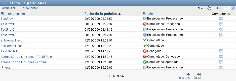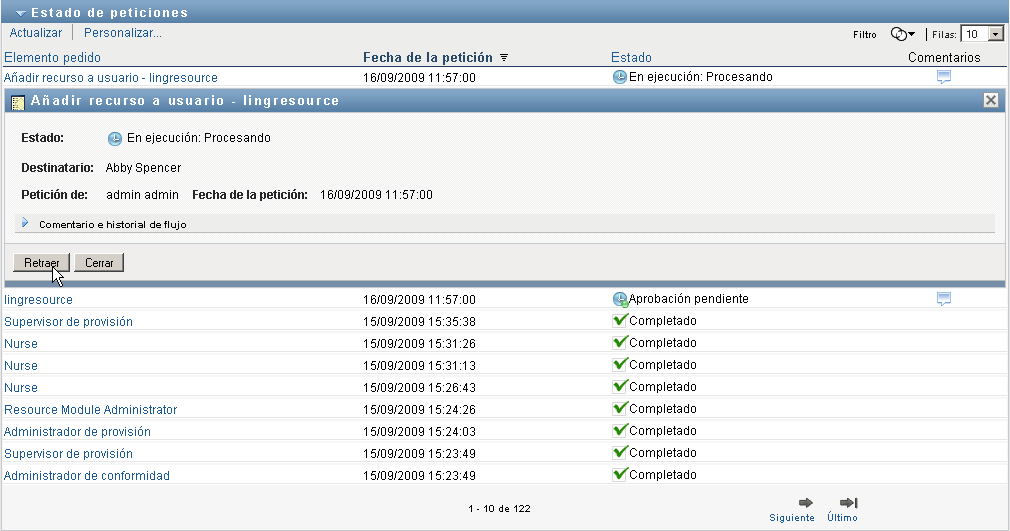 En la lista se incluyen las peticiones activas, las que se han aprobado y las que se han denegado. El administrador puede controlar el tiempo que se conservan los resultados de los flujos de trabajo. El sistema conserva por defecto los resultados del flujo de trabajo durante 120 días.