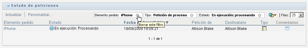 La lista de peticiones se actualiza para reflejar el estado actual de la lista de peticiones del usuario actual. El botón no elimina ningún filtro que se haya aplicado a la lista de peticiones. Cuando se actualiza la lista de peticiones, los filtros que se hayan definido se usarán para actualizar la lista, y seguirán en vigor hasta que los restablezca.