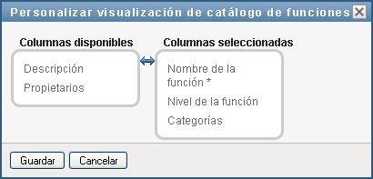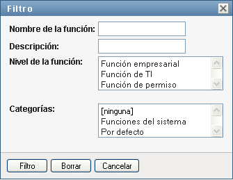 Especifique una cadena de filtro para el nombre de la función o para su descripción, o bien seleccione uno o varios niveles o categorías de funciones en el recuadro de diálogo