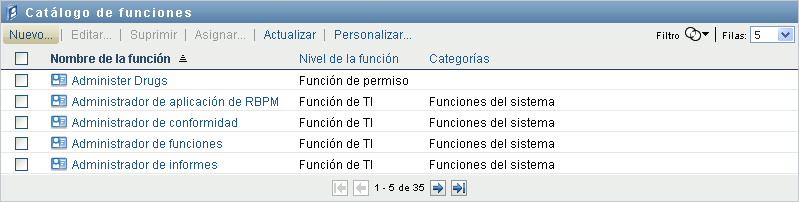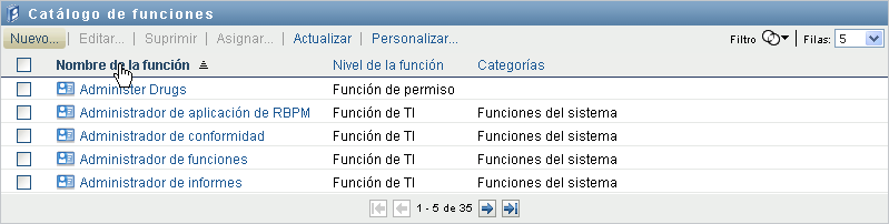 La acción de la pestaña de la interfaz de usuario del Gestor de identidades permite ver las funciones que se han definido anteriormente en el catálogo. También permite crear funciones nuevas y modificar, suprimir y asignar funciones existentes.