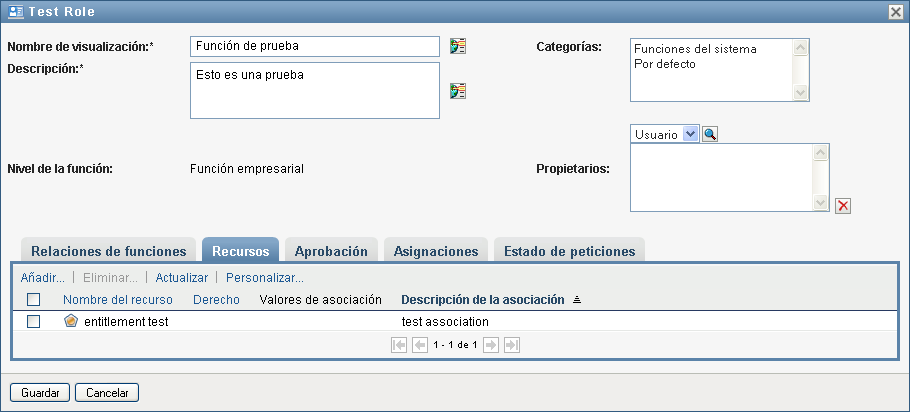 Derechos asociados con las funciones existentes. Puede que las funciones definidas en versiones anteriores del módulo de provisión basada en funciones tengan derechos asociados. Si una función tiene un derecho asociado, la interfaz de usuario muestra la pestaña que permite ver la asignación del derecho y, si se desea, eliminarla. Las asignaciones de derechos seguirán funcionando en esta versión, pero Novell recomienda ahora que los derechos se asocien con recursos, en lugar de con funciones.