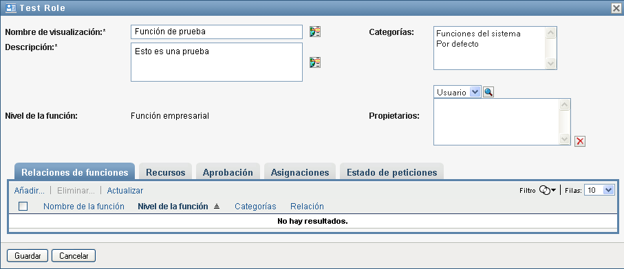 Las funciones de nivel inferior (funciones de permisos) pueden estar incluidas en funciones de nivel superior, pero no pueden contener otras funciones de nivel inferior. La página Relaciones de funciones sólo permite añadir una función de nivel superior.
